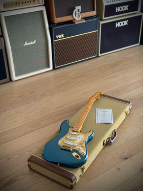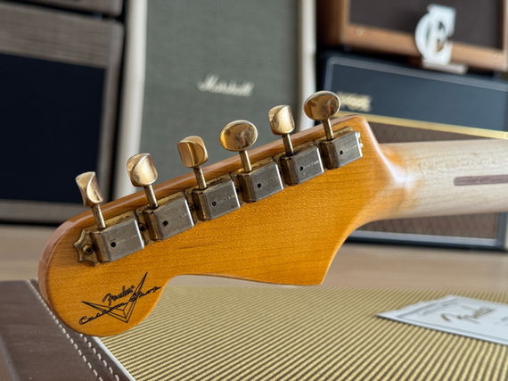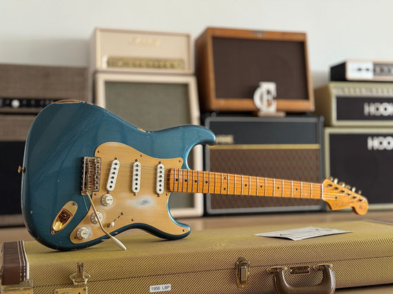 Alleine die wundervolle Farbe und das detailverliebte Aging sind schon eine Augenweide. Das Ganze wird noch edle garniert durch Goldhardware und ein Anodizes Pickguard. Hier hat man einen perfekten Mix aus edler Anmutung und Vintage Charme. Dadurch passt die Gitarre sowohl zum Anzug als auch zum löchrigen Shirt, ein absoluter Hingucker auf jeder Bühne oder einfach auch nur im Wohnzimmer. Trotz des eher schweren Pickguards, landen wir hier dank selektierter Hölzer bei entspannten 3,21kg voll mit 50s Strat Sounds der Oberklasse! Von spritzigen Cleansounds, über straffen, drahtigen Blues bis hin zu druckvollem Rock, lässt diese Gitarre wohl keine Wünsche offen. Zudem wurde noch ein anderer Kondensator verbaut, um noch feinfühliger mit den Potis arbeiten zu können. Der original Kondensator liegt jedoch im Case dabei.