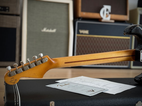 Es handelt sich um ein Prachtexemplar mit "lightweight select" Eschebody -> nur 3,15kg!. Der quartersawn Mapleneck kommt mit dem typischen Wildwood 10" Radius und griffigen Bünden für beste Bespielbarkeit. Das Halsprofil ist für eine 57er eher schlank, was ebenfalls extrem selten vorzufinden ist. Der Hals hat das mittlerweile bekannte Cruz 60`s Oval C Shaping, mit einem tollen „auf Anhieb Wohlfühl-Effekt“.