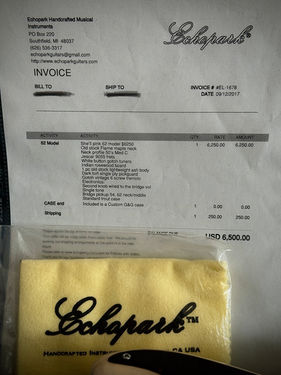 Echopark guarantees refined hand-built guitars with a deep bass and sparkling high. This guitar catches the eye with its transparent Shell pink finish, tortoise pickguard and cool relics. The body crafted with 2 pieces of ash, with a perfect bookmatch, equipped with a Gotoh vintage tremolo, a '54 pickup in the bridge position and '62 pickups in the middle and neck position. The rounded 'D' profile and a rosewood fingerboard with a 12" radius, provide the ultimate balance between diligent work and playing comfort. This pre-owned '62 guitar is in excellent condition, with various professionally applied and credible relics, some traces of use, such as a single dent and chip on the back. The aging of the pickup caps needs an honorable announcement here. This Shell pink sounds awesome: tight, defined, with the subtle twang and it is a real eye-catcher on stage. The guitar travels in a G&C hardshell case