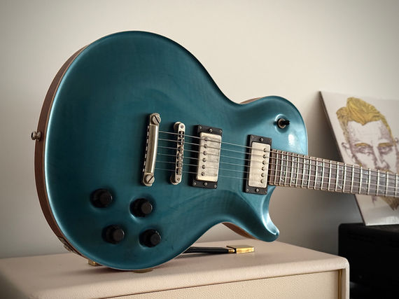 Die Basis bildet ein selektierter Mahagoni Body, der sogar leicht geflammt ist, siehe Rückseite. Dazu kommt ein sehr schönes Eastern Flame Mapletop, welches durch das hauchdünne transparent Petrol Blue Finish einen Mix aus High-end und Rock'n'Roll versprüht. Weiter gehts mit dem traumhaften Indian Rosewood Griffbrett zzgl. extravaganter Abalone Crown Ring Inlays. Um den Mix aus edler Erscheinung und Rock'n'Roll Flair zu intensivieren, wurde ein wunderschönes 3-D artiges Binding eingesetzt. Als wäre dies nicht genug, besteht die Kopfplatte, die Pickuprahmen, der Toggleswitch und die Poti-Knöpfe aus feinstem Ebenholz, alles absolut perfekt verarbeitet. Das ist Handwerkskunst auf höchstem Niveau.