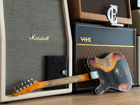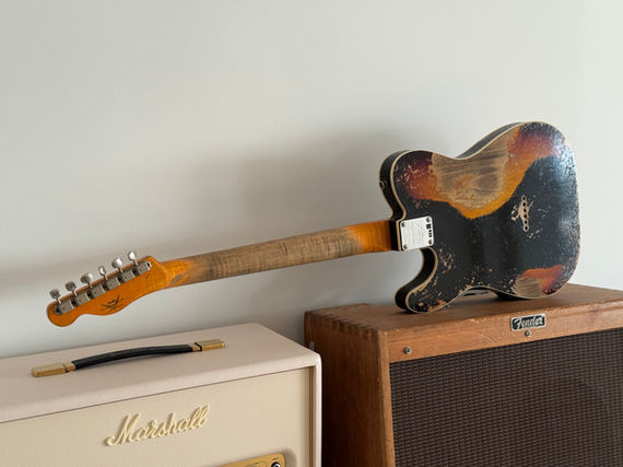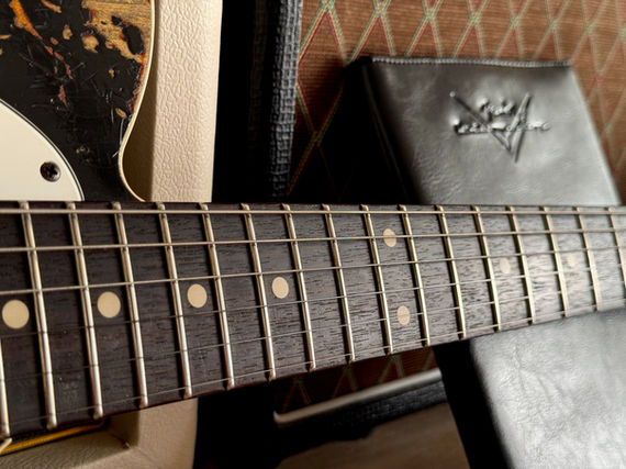 Hier ist alles von edelster Güte, das detailverliebte Aging, die resonanten Hölzer und die darauf abgestimmten Pickups, gepaart mit hervorragender Bespielbarkeit und erfreulichem Gesamtgewicht von nur 3,39kg. Die Hölzer sind selektiert, daher auch das ausgeprägte Resonanzverhalten und die schöne Optik des "wild grain flamed necks", welcher mit seinem 59 Large C Shape zwar etwas kräftiger aber dennoch äußerst angenehm in der Hand liegt. Das selektierte Rosewood Griffbrett hat ebenfalls eine schöne Maserung ist mit 6105 Bünden und einem 9.5"-12" Compound Radius ein Garant für komfortable Bespielbarkeit.