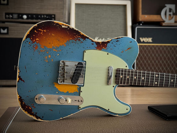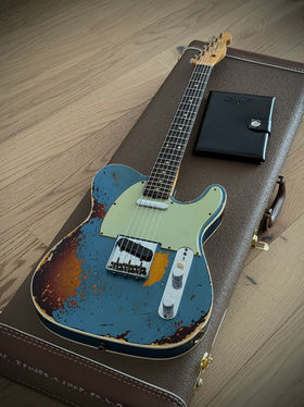 Diese wunderschönen 60s Custom Tele mit Double Binding und zeitgemäßen Spezifikationen ist wohl kaum zu übersehen. Dank des extrem aufwendigen Color over Color Finish, sind ihr zahlreiche Blicke garantiert. Dabei erinnert das Finish an die berühmte Masterbuilt Kunstwerke von Chris Flemming, der auch gezielt Lake Placid Blue over Chocolate Sunburst als Farbe etabliert hat.
