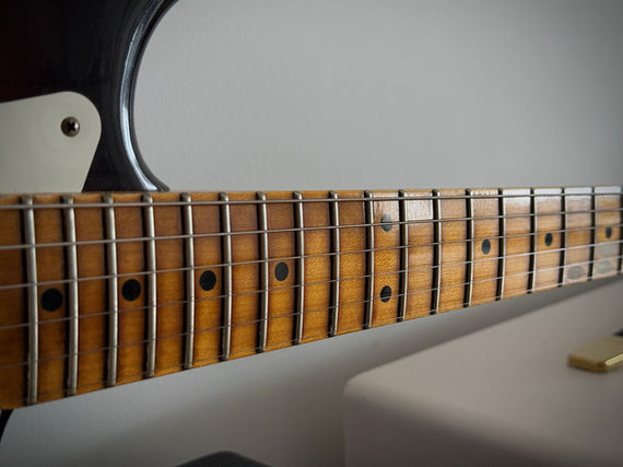 Der schöne Rift-Sawn Soft V Mapleneck beherbergt auf seinem 9.5" Radius sehr griffige 6100 Jumbo Bünde. Dies macht die Bespielbarkeit sehr angenehm, hier muss man nicht kämpfen wie bei einer Vintage Strat.