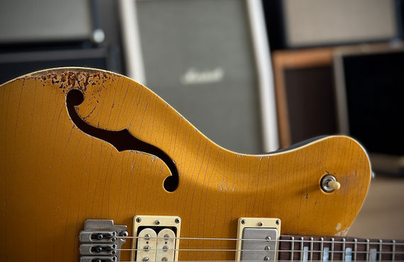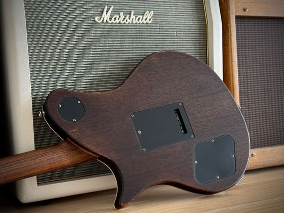 Die edlen Hölzer sind nicht nur optisch eine Bereicherung. Auch in Sachen Resonanzverhalten und Tonentfaltung machen sich die gut abgelagerten Hölzer positiv bemerkbar, besonders der Palisander Hals ist grandios. Carsten hat den Lightweight Mahagoni Body in einem charmanten Aged "Old Gold" gekonnt in Szene gesetzt, ähnlich wie bei der Gibson Joe Perry Gold Rush Limited Les Paul. Dieses Finish samt detailverliebten Aging würde sich so mancher Liebhaber des Murphy Labs wünschen, absolut perfekt!